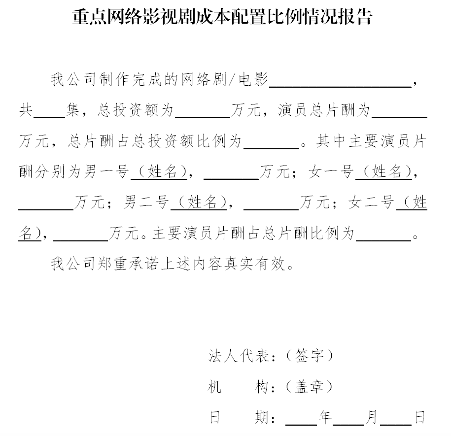 尤其是实际投资和演员片酬情况,这种在过去片方很少会透露的信息,现在片方在向省局、总局报送完成片审查时(包括直接报审片目和总局抽审片目),必须报送影视剧成本配置比例,其中就包括总投资额、总片酬占总投资额比例、主演片酬,以及主演片酬占总片酬比例。