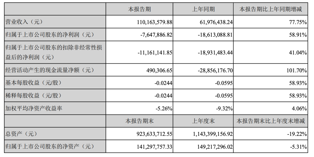 2020年上半年,天山生物实现营业收入1.10亿元,同比增长77.75%;归属净利润为-764.79万元,同比增长58.91%;扣非净利润为-1116.11万元,同比增长41.04%。