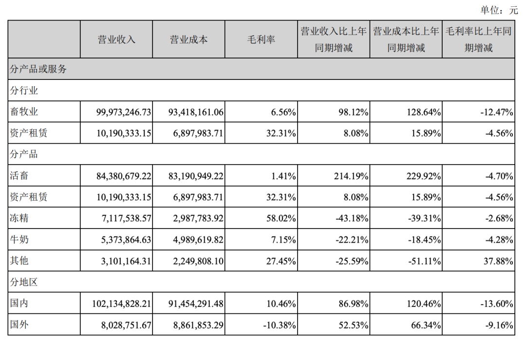 细分来看,活畜收入为8438.07万元,同比增长214.19%,但该业务营业成本增速为229.92%远高于营业收入,致使毛利率同比减少4.70%仅为1.41%;资产租赁成为第二大收入来源,实现收入1019.03万元;冻精收入同比下降43.18%至711.75万元;牛奶收入同比下降22.21%至537.39万元。