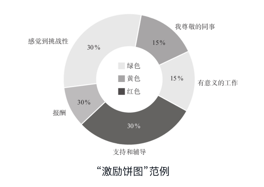 可是它真的很实用。激励饼图不同于绩效考核,后者是让我们衡量某人的表现与组织为其设定的目标相比有何差距,而前者问的是一个组织的做法与激励某一个人需要达到的标准相比有何差距。这个工具的用法特别简单,你只需要让人们完成以下三个步骤:
