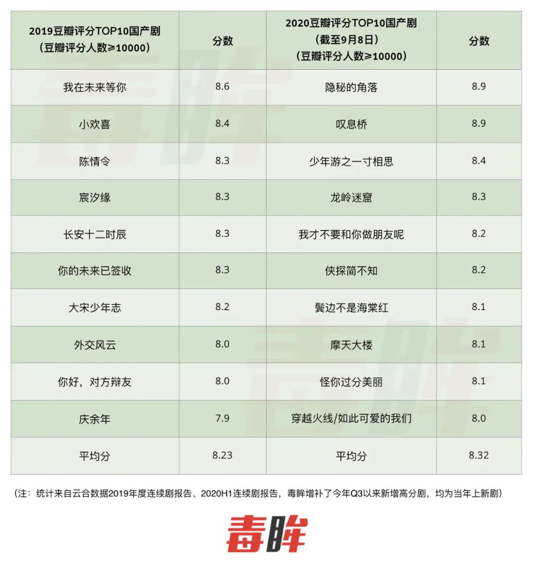毒眸统计发现,截至9月8日,2020年豆瓣分数TOP10的国产剧(豆瓣评分人数≥10000)平均分为8.32,比2019年全年TOP10国产剧的平均分8.23高出近0.1分。