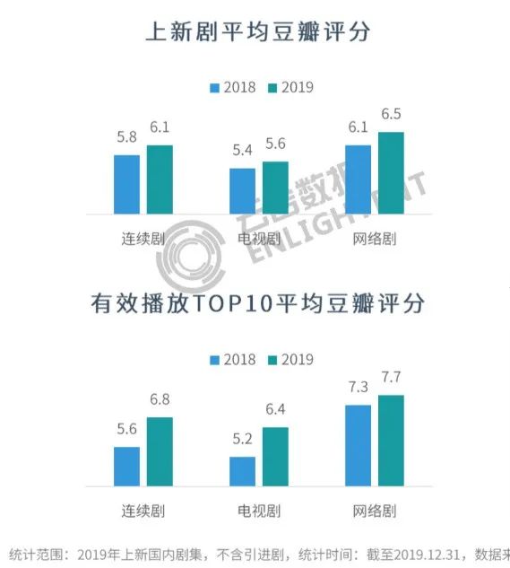 据云合数据统计,2019年连续剧整体豆瓣平均分6.1,相比2018年的5.8分,上升了足足0.3分,其中又以网络剧均分上涨幅度更大,从2018年的6.1上升到2019年的6.5。