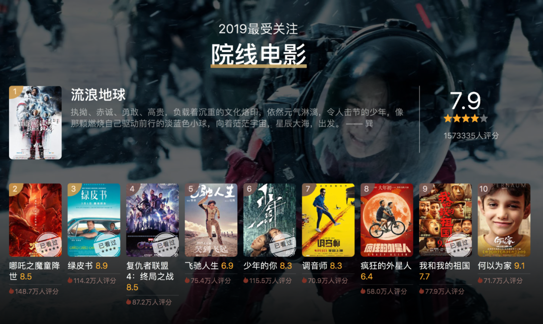 豆瓣2019年度电影榜单之评分人数最多的院线电影