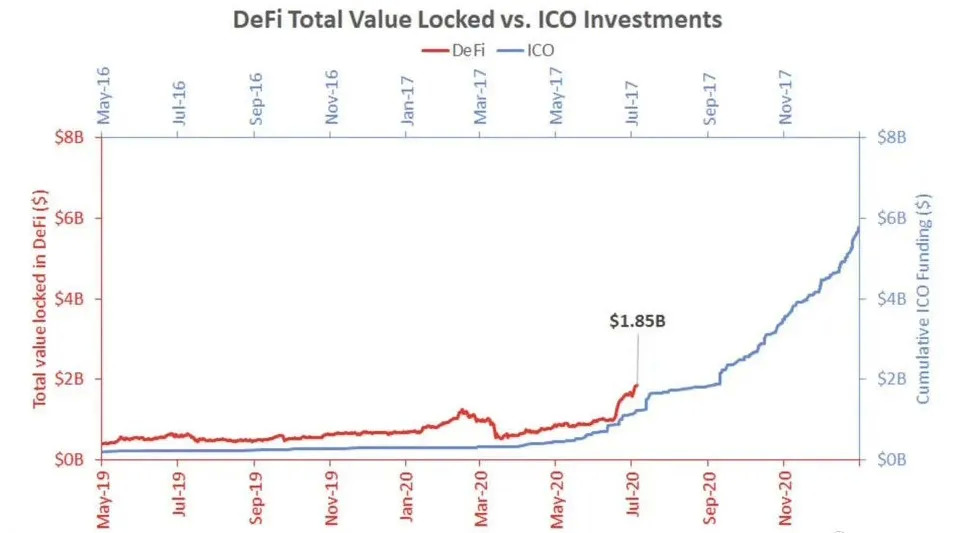 DeFi中锁定资产总价值与同期ICO累积资金走势对比来源:Coindesk