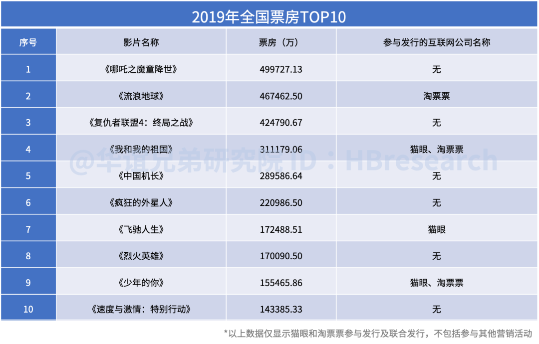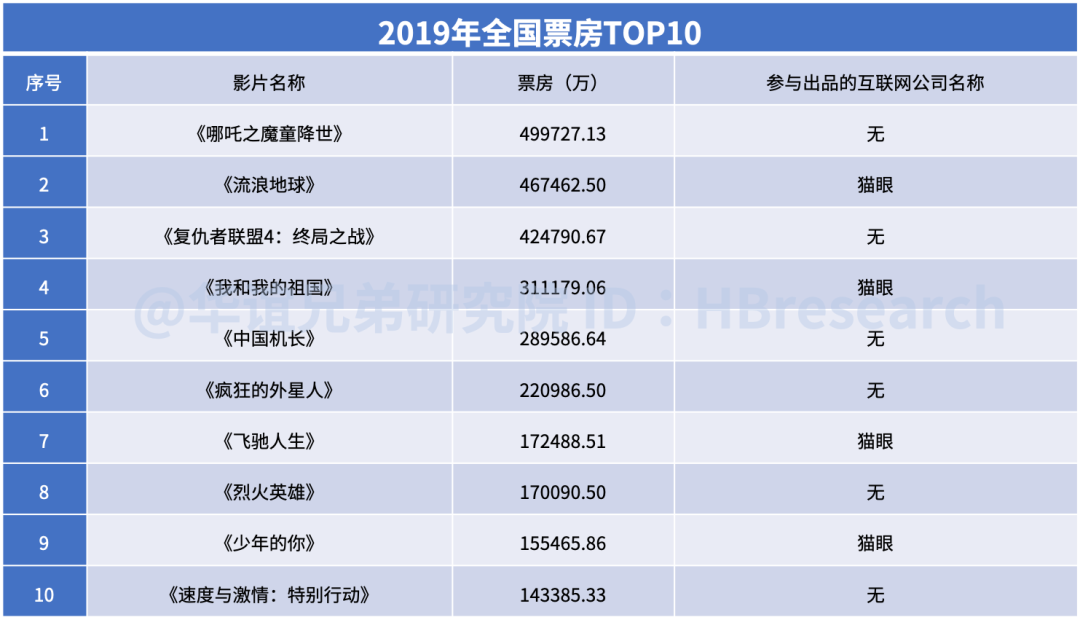 宏观2019年全国票房前十,不难发现影片资本背后除了有传统影视制片公司主控,互联网公司也开始“入侵”跟投分羹。据艺恩显示,截止2020年9月7日,猫眼微影文化累计出品40部影片,总票房累计209.5亿,位于出品票房排片榜第11名;淘票票出品影片数量为10部,出品总票房162.7亿,位居排行榜第19名。