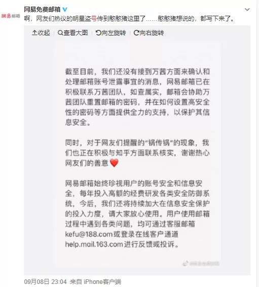 反倒是被网友热议的网易,在9月8日深夜,进行了回应。微博表示,截至目前并未没有接到万茜方面来确认和处理邮箱账号泄露事宜的消息,网易邮箱已在积极联系万茜团队。于是,#网易邮箱回应万茜被盗号#话题今天冲上微博热搜第3名,阅读量近3亿。
