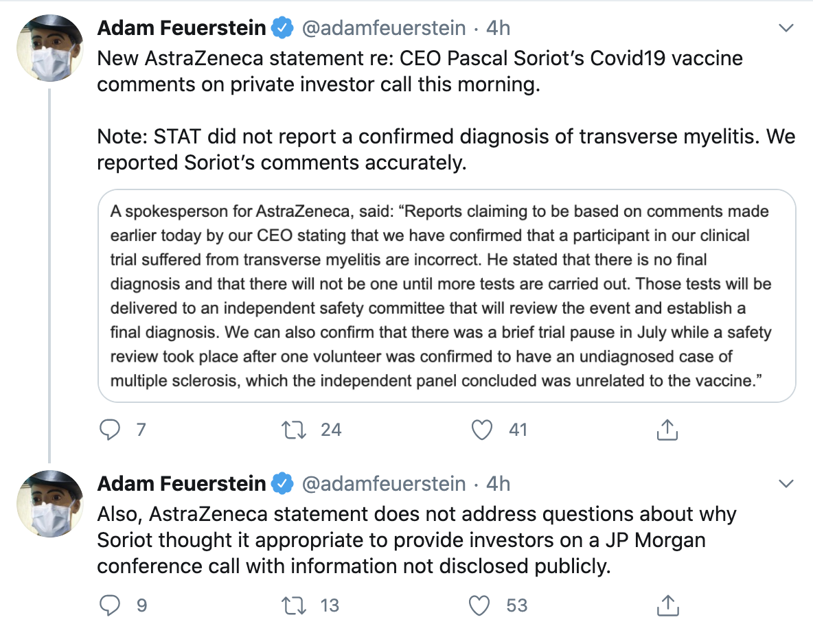 美国健康新闻网站STAT高级记者Adam Feuerstein周三援引阿斯利康发言人的声明报道说,部分有关阿斯利康暂停新冠疫苗试验研究的报道失实。