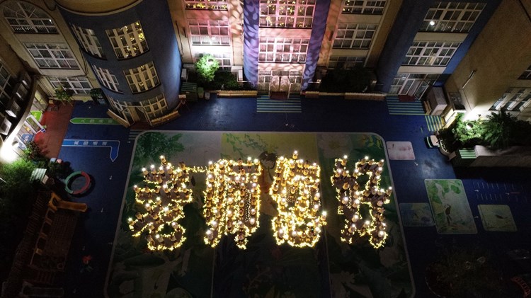 2020年9月9日晚上,合肥,庐阳实验幼儿园红玺台总园举行“我为教师节亮灯”活动,150名教职员工通过挥舞手机闪光灯在夜空中点亮“老师您好”四个大字。