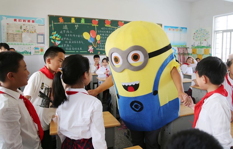 2020年9月9日,在江苏省海安市城东镇西场小学,老师扮演“小黄人”和学生一起做游戏,庆祝教师节。