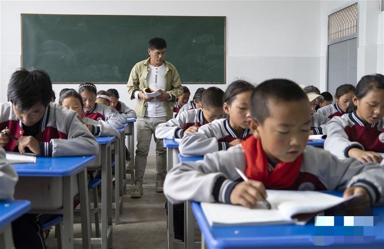 2020年9月9日,在四川省凉山彝族自治州布拖县阿布泽鲁小学,江忠国在上语文课。今年53岁的江忠国来自安徽省安庆市,现在是四川省凉山彝族自治州布拖县阿布泽鲁小学的一名教师。从部队转业后,他曾在福建、上海等地做生意。2003年至2005年,他在安徽铜陵脱产进修,取得大专学历。他十分关注家乡大别山的教育,曾长期资助安徽金寨两名贫困学生。2016年4月,他在网上看到招募令,出于好奇,来到了在他心目中十分神秘的大凉山。 “本来计划做管理工作,几个月就走。但是来了发现教师人手非常短缺,就一直留下来教书了。”
