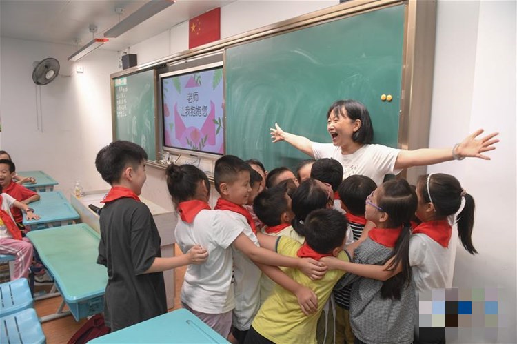 2020年9月9日,在福州市乌山小学,二年级学生在《老师,让我抱抱您》主题班会上拥抱老师。 教师节前夕,福建省福州市中小学校纷纷开展尊师重教主题活动,向老师表达感恩之心。
