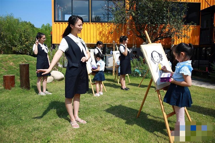 2020年9月8日,在浙江省东阳市实验幼儿园内,小朋友现场为老师画像。 教师节临近,各地人们以不同形式感念师恩,迎接即将到来的教师节。