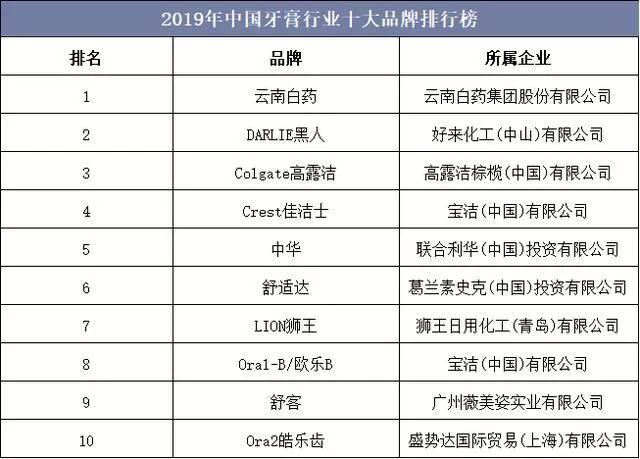 2014年,跨界而来的云南白药牙膏打败高露洁,跻身中国市场牙膏品牌前三名。同年前十品牌分别为,黑人、佳洁士、云南白药、高露洁、中华、冷酸灵、纳爱斯、舒客、舒适达、LG竹盐。2019年,云南白药牙膏又成功超越黑人,成为中国牙膏市场里的国货牙膏第一品牌。这背后,中国牙膏市场规模由2013年仅有197亿元到2019年增至291亿元,且牙膏市场需求结构发生变化,中高端牙膏逐渐成为新型消费趋势。