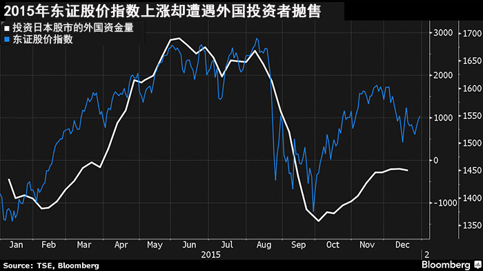 彭博数据显示,2015年外国投资者抛售了19亿美元日本股票,日本本土的养老基金、资产管理公司、央行和公司则“趁虚而入”。上次外国投资者减持日本股票却遭遇年度上涨还是25年前。高盛投资公司日本分公司副总裁兼首席分析师松井(Kathy Matsui)说:“海外投资者抛售日本股票明显是个错误”。