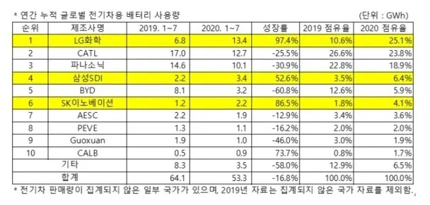 增长迅速的不仅是LG化学,三星SDI和SK创新也有比较大幅的提升,两者在今年的累计装机量分别为3.4GWh和2.2GWh,同比增长高达52.6%和86.5%,并以以6.4%和4.1%的市场份额排在第四和第六。