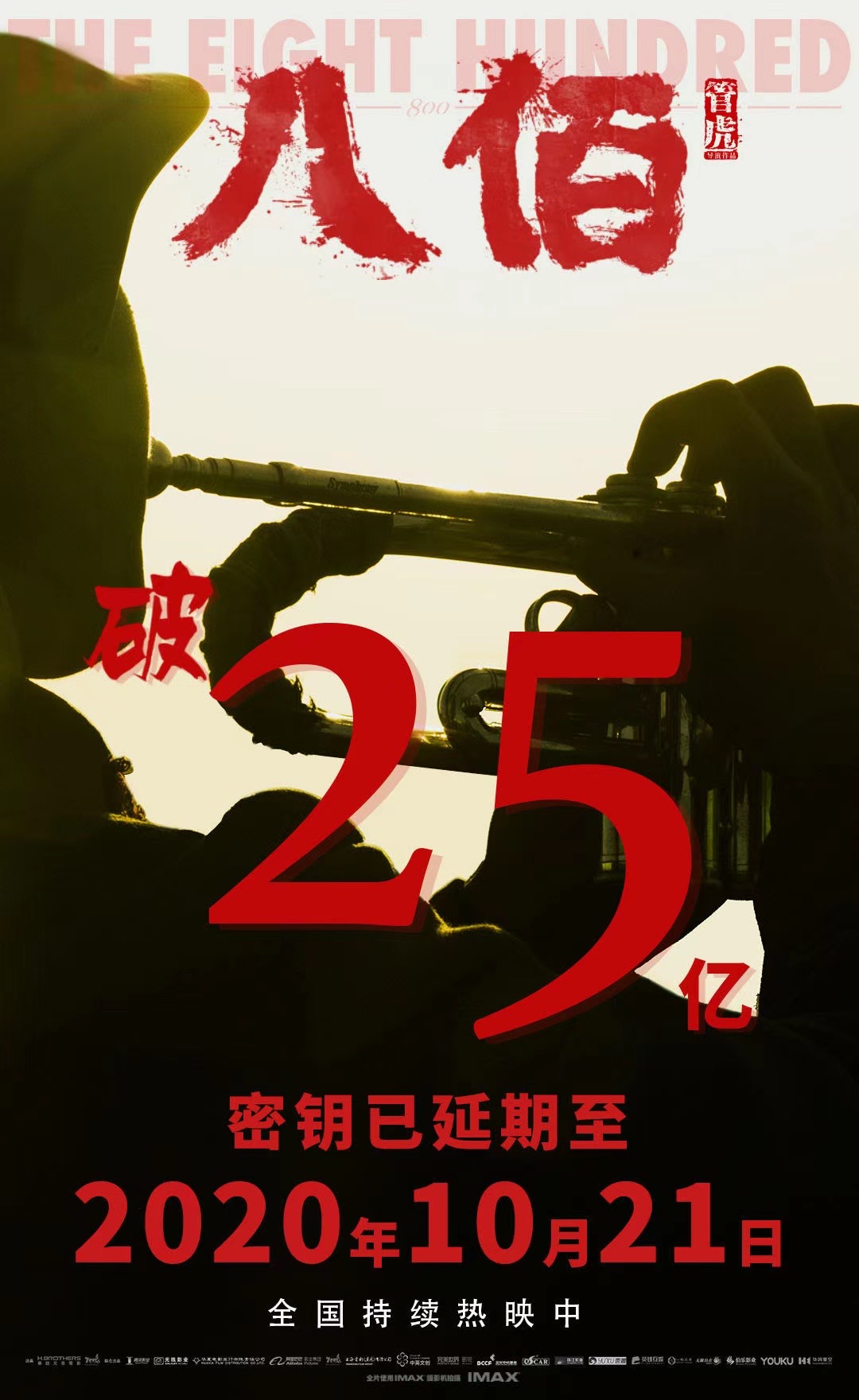 9月9日,《八佰》总票房突破25亿元,同时宣布密钥延期至10月21日。该片在8月21日正式上映后,连续20日保持单日票房冠军。