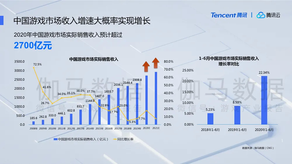 伽马数据(微信号:游戏产业报告)和腾讯云发布的《2020游戏产业趋势报告》研究认为:2020年因为疫情防控等特殊原因,上半年中国游戏产业增长迅猛,下半年将保持持续增长的势头。