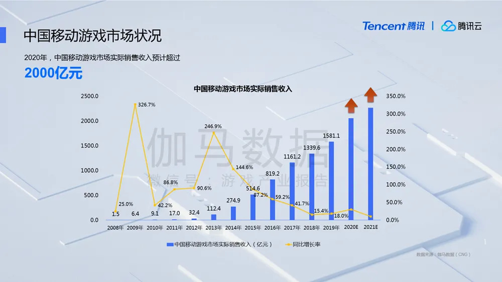 报告数据显示:2020年,中国游戏市场实际销售收入预计超2700亿元,增幅不少于17%。而其中,2020年中国移动游戏市场实际销售收入预计超2000亿,同比增幅可能超过30%。