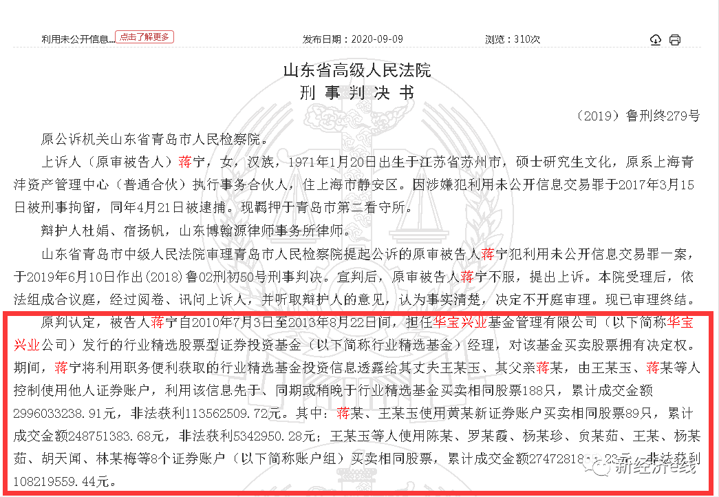 上述判决书显示,经查,蒋宁作为华宝行业精选的基金经理,掌握该基金交易的标的股票、交易时间、交易数量、交易价格及盈利预期等未公开信息。蒋宁通过与其父蒋某、其夫王某玉的交流、带回家的行业精选基金持仓明细、带领王某玉对上市公司调研等方式使蒋、王二人知悉上述信息。