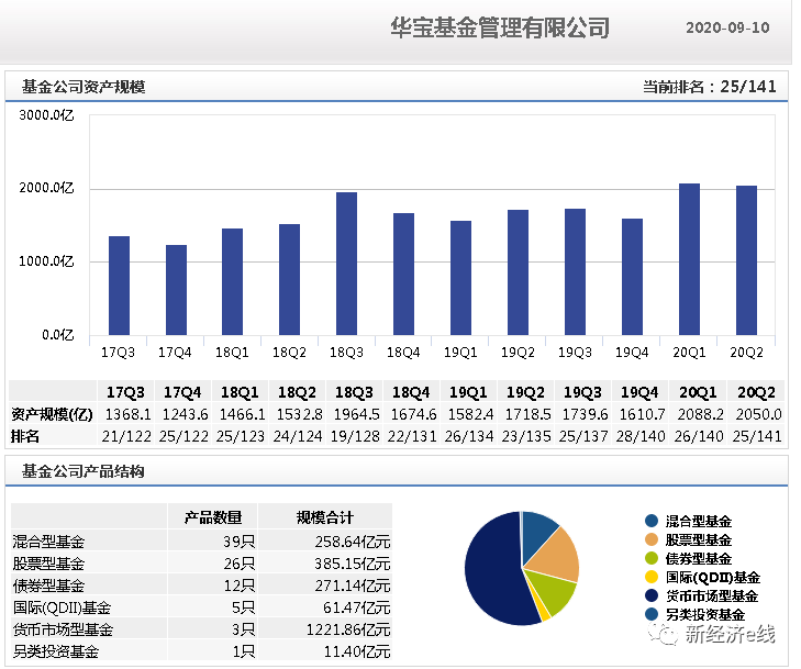 据新经济e线了解,自2003年3月7日成立至今,华宝基金规模仍停留在如今的2000亿元关口,其中,非货币资产规模尚不足千亿元。从最近三年的行业排名来看,表现最佳的一年为2018Q3,业内排名19/128。