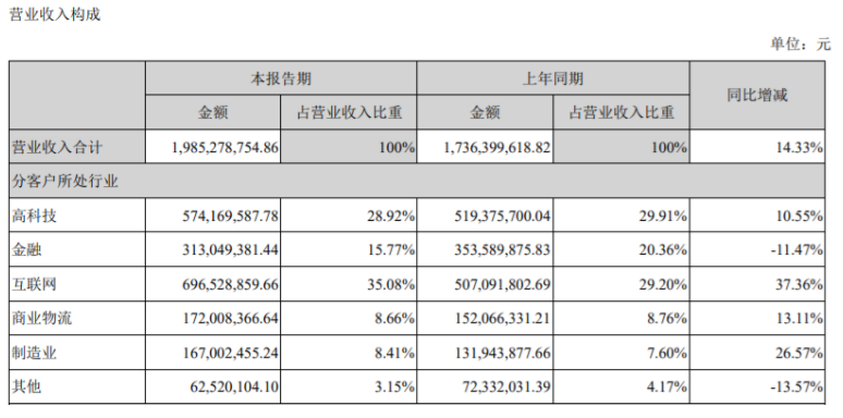 半年报显示,博彦科技为IT咨询、产品及解决方案与服务提供商,主要业务涵盖产品及解决方案、研发工程服务和IT运营维护。上半年营业收入19.85亿元,同比增长14.33%;净利润1.15亿元,同比增长4.72%;扣非净利润1.01亿元,同比下降0.38%。从营收构成来看,金融行业客户上半年为博彦科技实现收入3.13亿元,与去年同期相比下降11.47%,占总营收比重15.77%,去年同期占营收比重20.36%。