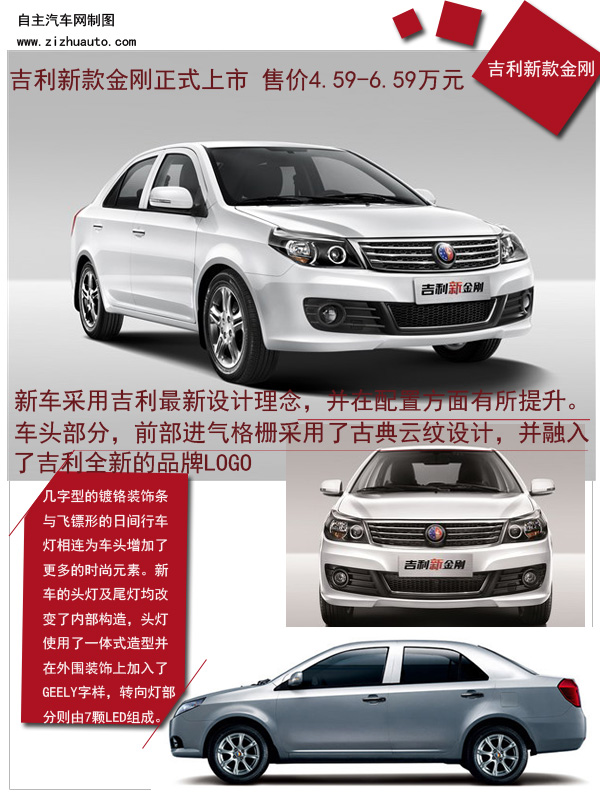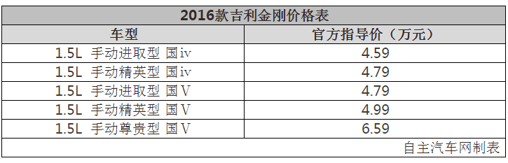 2016年1月1日,吉利汽车旗下新款金刚正式上市,新车共推出5款车型,售价区间为4.59-6.59万元。