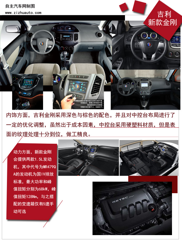 2016款金刚提供两款1.5L发动机,其中代号为MR479QA的发动机为国IV排放标准,最大功率和峰值扭矩分别为68kW,峰值扭矩128Nm,与之搭配的变速箱仅有5速手动可选;另一款代号为JLB-4G15的发动机能够达到国V排放,最大功率75kW,峰值扭矩141Nm,变速箱可选5速手动或4速手自一体。