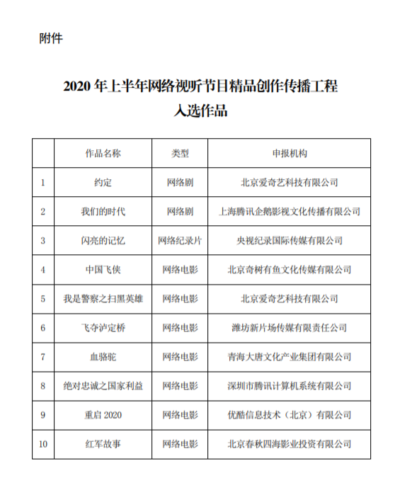 9月10日,广电总局发布文称,2020年网络视听节目精品创作传播工程在上、下半年分两次举行。在上半年的活动中,经各中央直属单位和省级广电行政部门推荐,广电总局组织专家进行多轮评审,最终评选出10部优秀网络视听作品作为2020年网络视听节目精品创作传播工程重点扶持作品。广电总局将对重点作品提供资金扶持,并对其创作播出进行全方位指导帮助。