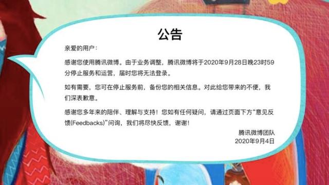 9月5日,腾讯微博团队发布公告称,由于业务调整,腾讯微博将于2020年9月28日停止服务和运营,届时将无法登录。