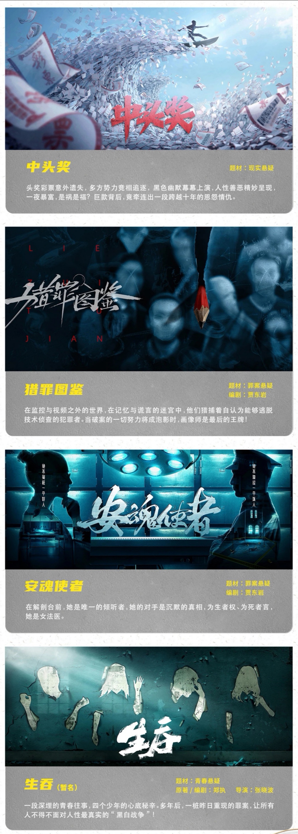 这次柠萌影业的短剧集片单一共有五部,除了关注两性话题的《这里没有痴男怨女》,其余四部《中头奖》《猎罪图鉴》《安魂使者》《生吞》均为悬疑题材,黑色幽默风格、罪案风格、青春风格均有涉猎。