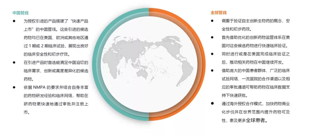 双轮研发策略驱动,通过全球的成熟系统快速完成临床验证(I期临床或部分II期临床);然后在中国加速进行适合中国患者的临床开发,让新药更早地在中国上市造福患者。