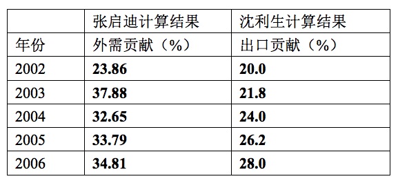 2,该种计算方法有错的原因在于,进口全部从出口中扣除,而实际上在消费和投资中也有进口。如此就低估了外需的作用,高估了内需的作用。正确的做法是把三驾马车中含有的进口分别予以扣除。张启迪的做法是使用进口(加工贸易)来代表与出口相对应的进口部分,这样外需=出口-进口(加工贸易),内需=GDP-外需。这种做法其实正是南京财经大学尹敬东教授的做法(尹敬东:外贸对经济增长的贡献: 中国经济增长奇迹的需求解析,数量经济技术经济研究,2007 年第10 期)。笔者分析了此种做法存在的误差。对外贸易除了加工贸易外,还有一般贸易。一般贸易中的进口品中有一部分直接进入最终产品,还有相当大部分进入生产过程,其价值转移到最终产品中,其中不但转移到消费品和投资品中,也转移到出口产品中。如果出口产品中不扣除这部分一般贸易进口的转移价值,就会高估出口的作用。相应就低估了消费和投资的拉动作用。