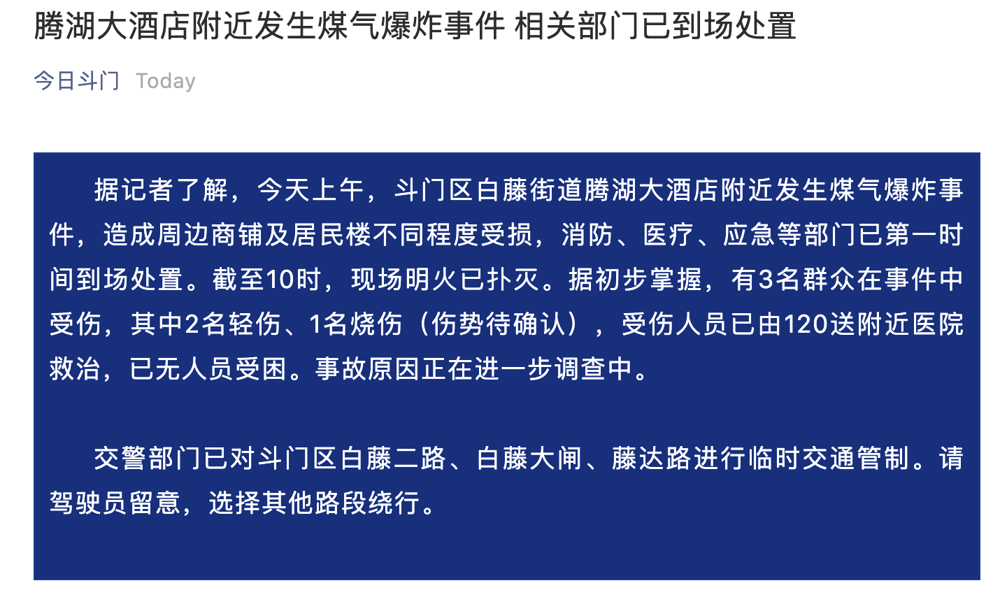 中共珠海市斗门区委宣传部官方微信公众号“今日斗门”消息,据记者了解,今天上午,斗门区白藤街道腾湖大酒店附近发生煤气爆炸事件,造成周边商铺及居民楼不同程度受损,消防、医疗、应急等部门已第一时间到场处置。