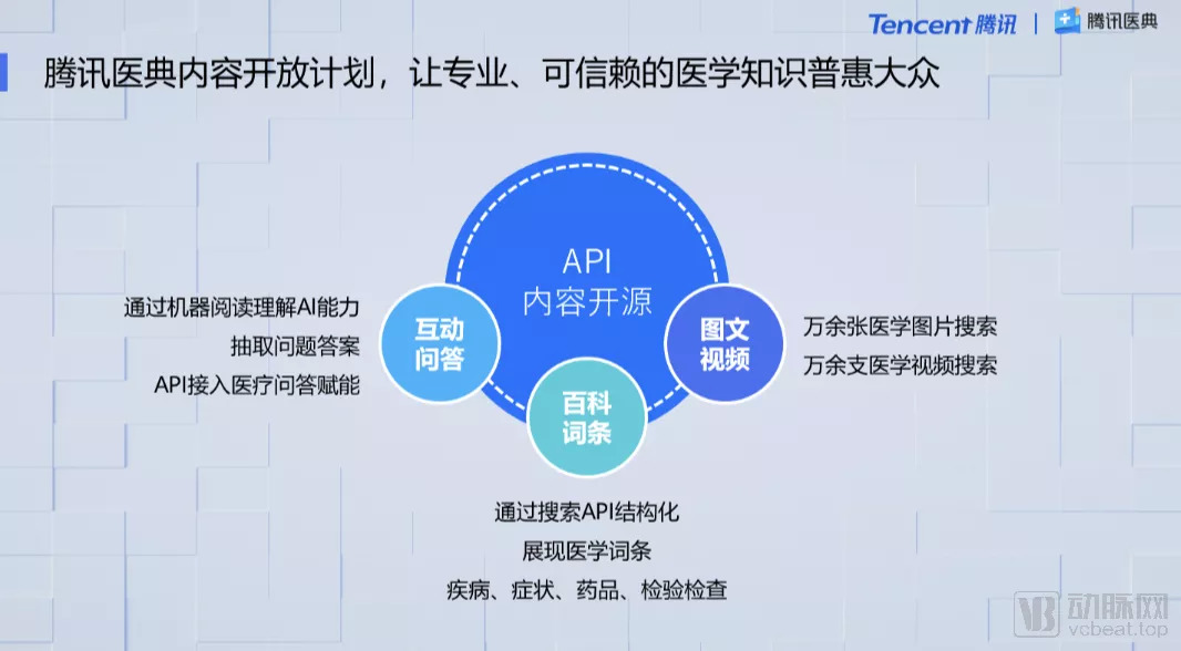转变发生在2020年腾讯全球数字生态大会上。昨日,腾讯医疗副总裁黄磊宣布开放腾讯医典API,尝试与搜索入口、内容平台、移动应用、智能硬件等不同类型的平台建立合作,这些合作或许能够促成医典成为一个双向开放的内容平台。