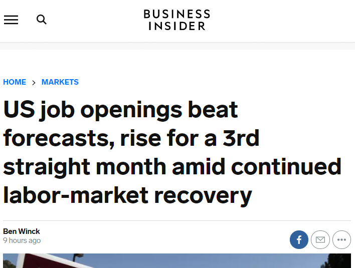 △《商业内幕》称,在劳动力市场持续复苏的情况下,美国空缺职位连续3个月增加
