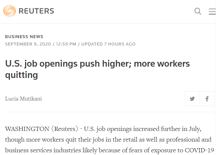 美国劳工部9月9日发布的报告同时显示,7月自愿辞职的人数增加了34.4万人,达到290万人,高于6月的260万人。这一数据的意外攀升引起不少忧虑,因为当就业市场疲软时,人们通常不愿辞职。不过,今年夏季情况特殊之处在于,许多人是为了避免感染新冠病毒而不想上班,还有些人则是为了照顾无法返校的孩子而留在家中。