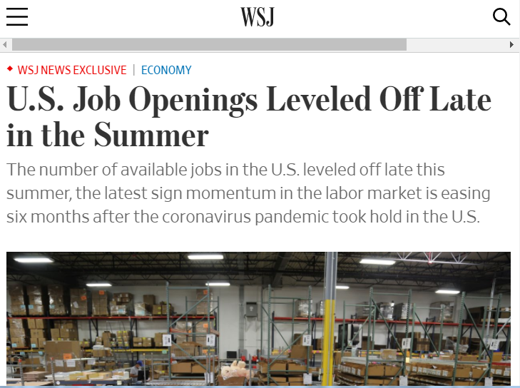 此次的职位空缺报告是在上周的非农就业报告后发布的,两者往往会被拿来分析对照。8月美国非农部门新增就业人数为137万人,低于市场预期,也不及7月修正后的水平。而在因疫情失去的2220万个工作岗位中,目前仅恢复了大约1060万个,其中6月新增480万个就业岗位,7月这一数字下降到了173万个,8月已经降至137万个,显示美国经济虽然逐渐反弹,但就业复苏步伐仍在放缓。