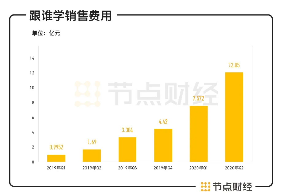 根据财报,跟谁学销售费用增长超7倍,从去年同期的1.69亿元增长至12.05亿元,占营收比例高达73%。