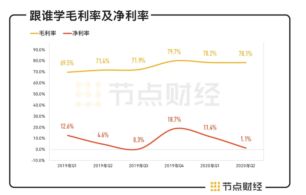财报显示,跟谁学上市后的4个季度里,2019年第三季度毛利率为71.9%,第四季度为79.7%,2020年两个季度分别为78.2%、78.1%。