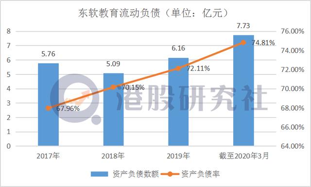 与此同时,负债率却在节节攀升。2017-2019年,东软教育的资产负债率分别为67.96%、70.15%、72.11%,截至2020年3月31日,东软教育的总资产为30.02亿元,总负债为22.46亿元,资产负债率进一步提升为74.81%。
