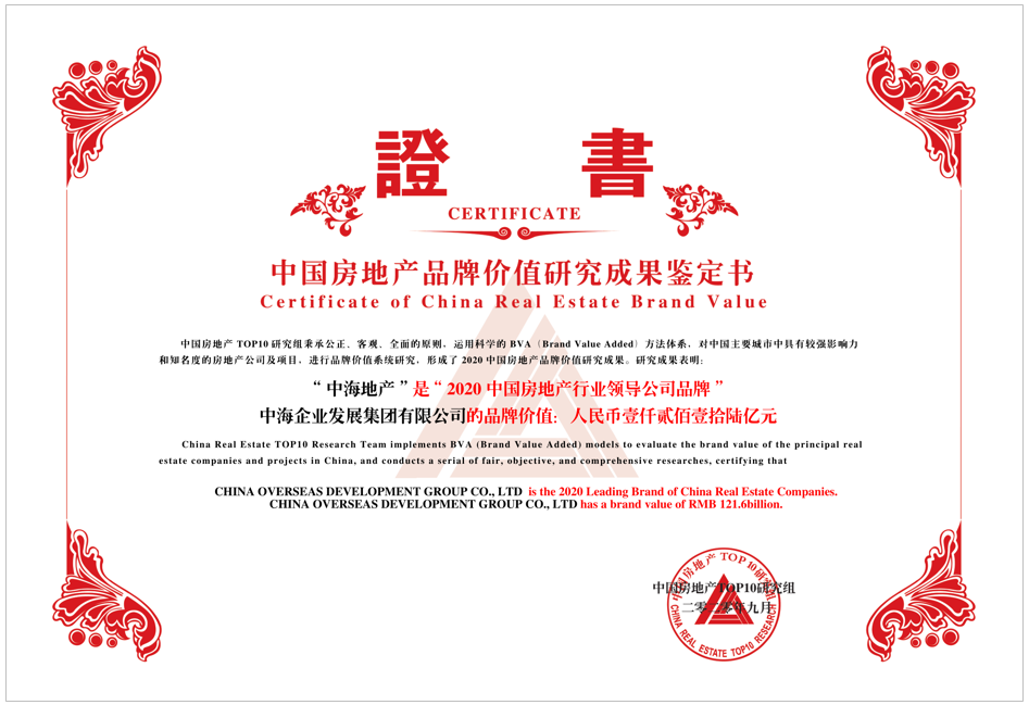 2020年9月10日,由国务院发展研究中心企业研究所、清华大学房地产研究所、中国指数研究院主办的“2020中国房地产品牌价值研究成果发布会暨第十七届中国房地产品牌发展高峰论坛”在北京举行,中国海外发展副总裁欧阳国欣出席。中海地产第十七次荣获“中国房地产行业领导公司品牌”,品牌价值达人民币1216亿元,蝉联行业第一。