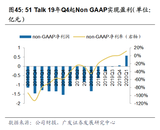广发证券今年7月发布的研报显示,目前,在线一对一头部公司领先地位逐步强化,行业集中度提升,获客成本相对行业整体已经逐渐下降,实现盈利可期。其中,“51 Talk从19年Q4起Non GAAP口径实现盈利。2020Q1的Non GAAP净利润为5699万元,Non GAAP净利率为11.7%。近年来公司控费水平持续优化,2020Q1销售费用率已经降至47%。 ”