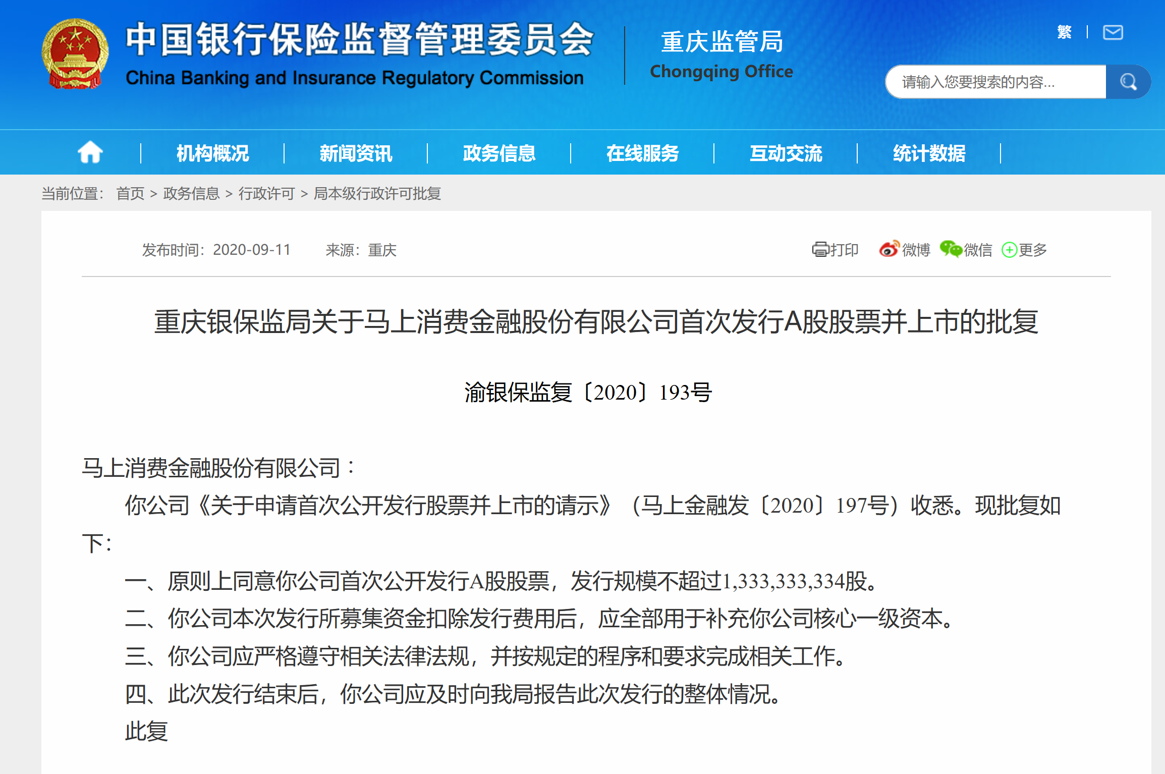 9月11日,重庆银保监局官网发布《关于马上消费金融股份有限公司首次发行A股股票并上市的批复》。