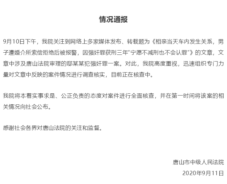 唐山市中级人民法院微信消息,9月10日下午,唐山中院关注到网络上多家媒体发布、转载题为《相亲当天车内发生关系,男子遭婚介所索偿拒绝后被报警,因强奸罪获刑三年“宁愿不减刑也不会认罪”》的文章,文章中涉及唐山法院审理的邸某某犯强奸罪一案。对此,唐山中院高度重视,迅速组织专门力量对文章中反映的案件情况进行调查核实,目前正在核查中。