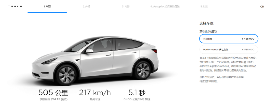 与之同步进行的,特斯拉官网也在近日公开了Model Y的预售选配配置和价格,分别为48.8万的长续航版和53.5万的高性能版,并且注明该车型将在2021年量产交付。