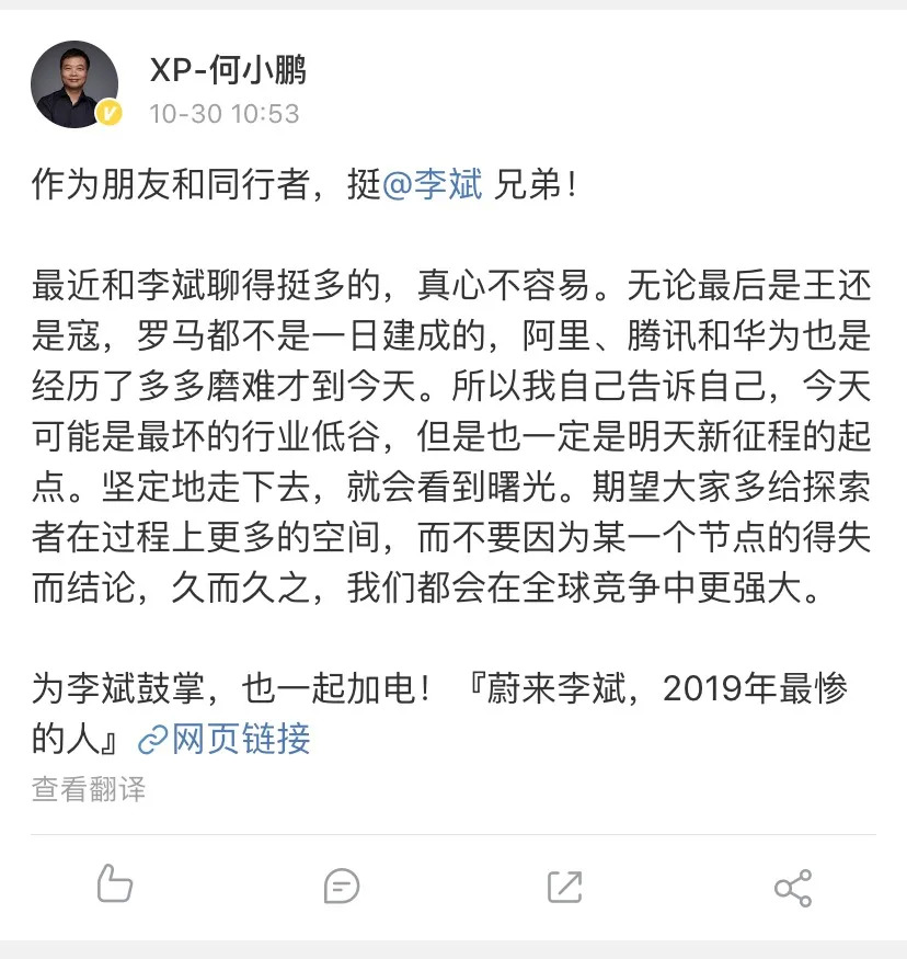 何小鹏对此第一时间在微博上转发了这篇《李斌,2019年最惨的人》,并力挺李斌“坚定的走下去,就会看到曙光。”