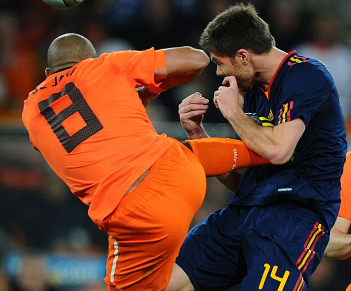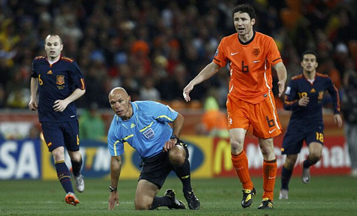 在这场比赛的第28分钟,荷兰中场球员德容用一个类似于中国功夫的动作飞踹阿隆索,对于这次犯规主裁判韦伯只是出示了一张黄牌。这个判罚让当时在约翰内斯堡足球城体育场观战的很多观众都困惑不解。