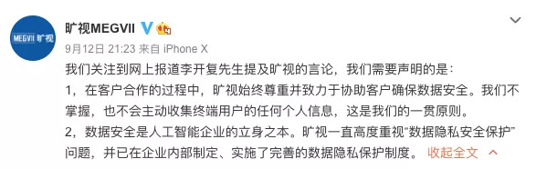 随后,北京旷视科技有限公司官微发布消息称,已关注到网上报道李开复先生提及旷视的言论。声明称,在客户合作的过程中,旷视始终尊重并致力于协助客户确保数据安全。