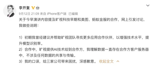 “合作中,旷视提供AI技术给到合作方,我理解数据一直存在合作方客户服务器中,不涉及任何数据的共享与传输。”李开复还表示,“我的口误,给三家公司带来困扰,深感歉意。”