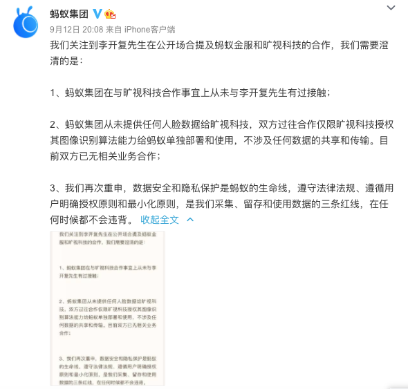 当晚,蚂蚁集团官方表示,从未提供任何人脸数据给旷视科技;旷视科技也表示,不掌握也不会主动收集终端用户的任何个人信息。对此,李开复向三家公司道歉,表示系自己“口误”。